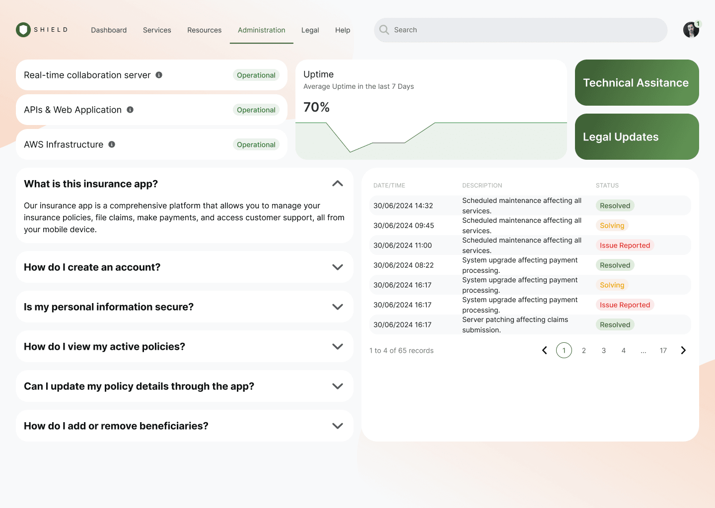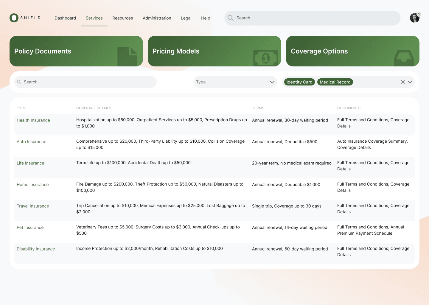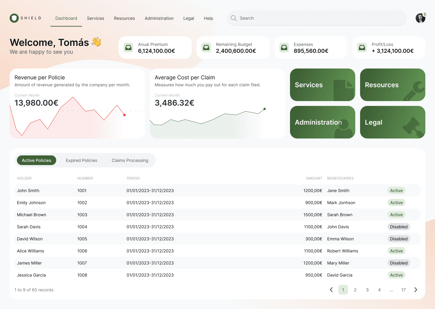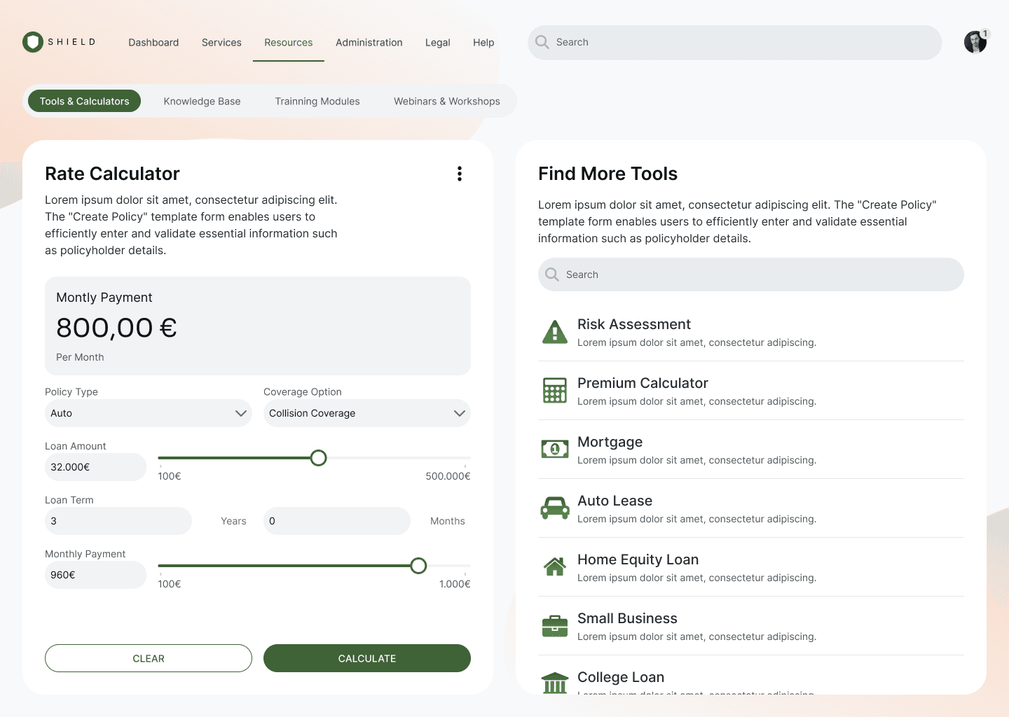 Dashboards for policy and claims overview; Document and coverage management; Training modules, knowledge base, and webinars; Calculators for coverage and savings goals; User management and ticketing system for support; Platform customization and integrations; Light & Dark Mode: Two configurations included by default; Ready-made layouts: Optimised templates for insurance operations; Responsive by default: Adapts seamlessly to mobile, tablet, and desktop;